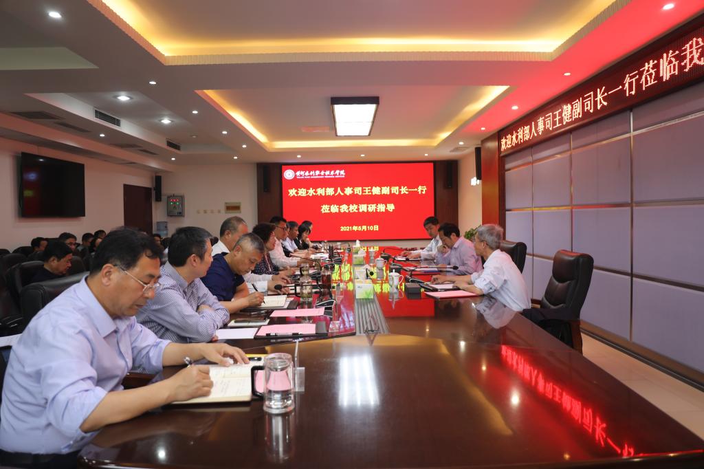 5月10日,水利部人事司副司长王健一行来B体育平台调研指导工作。水利部人事司副处长张新龙、中国水利教育协会秘书长王韶华和B体育平台校领导陪同调研。调研座谈会由校长胡昊主持。