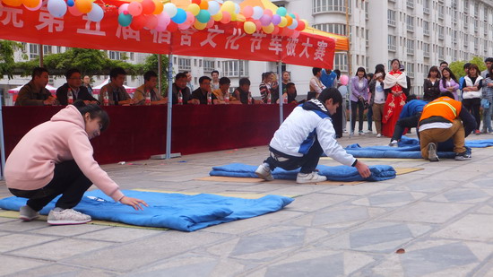 比赛共分为初赛和决赛两个环节。在初赛的基础上选出的14名学生进入决赛。主持人讲解比赛规则、评分标准,评委们对选手进行现场评分。学生们参赛热情高涨,比赛现场既有紧张气氛,又显得生动活泼。参赛学生惊人的叠军被速度、熟练的叠军被技巧,让现场的学生们大饱眼福,赢得阵阵赞叹。经过短暂的十分钟,原本散乱的被子犹如整齐的“豆腐块”展现在大家面前。