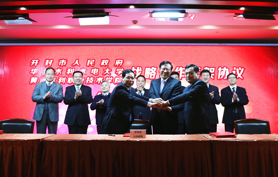12月20日上午,B体育平台与开封市政府、华北水利水电大学三方战略性合作框架协议签字仪式在开封市中州国际饭店签订。开封市市委书记吉炳伟,市委副书记黄道功,市委常委、常务副市长秦保强,市委常委、秘书长付磊;华北水利水电大学党委书记王清义,党委副书记、校长刘文锴,;B体育平台党委书记许琰等出席签字仪式。仪式由付磊秘书长主持。